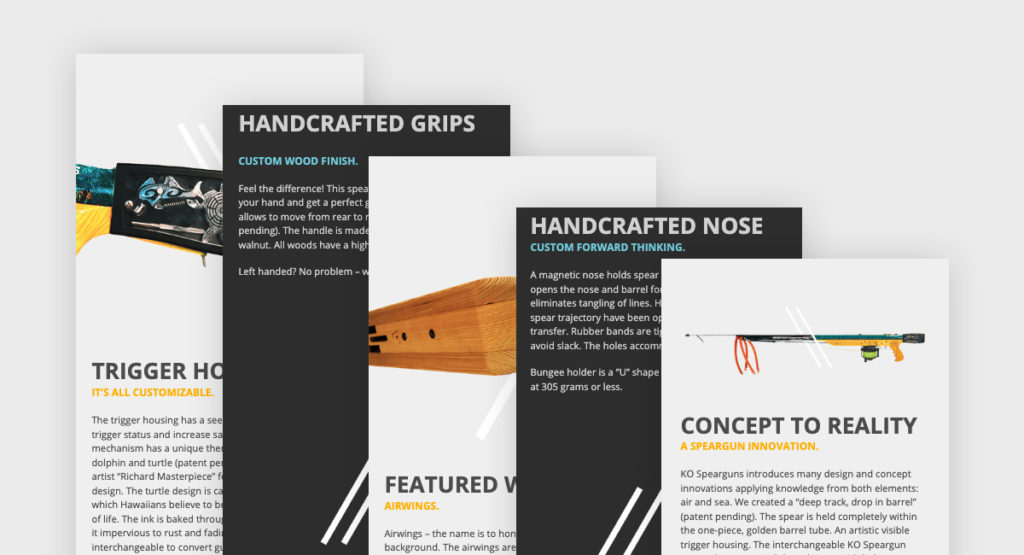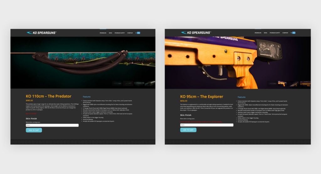Where aerospace innovation meets artistic style. KO Spearguns is a company who prides themselves in heritage and quality. We handled everything from custom illustrations, eCommerce site design and development, and product and lifestyle photoshoots, to deliver the final shopping site.